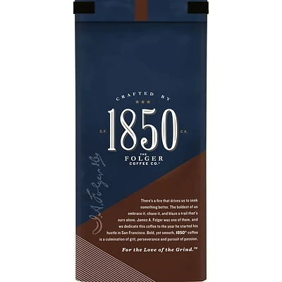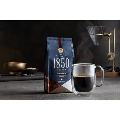 Start your day with bold 1850 Black Gold Dark Roast Ground Coffee. Made with a smooth blend of 100 percent Arabica beans, this dark roast coffee offers notes of sweet dark cocoa.
