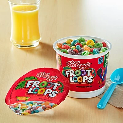 Stock your kitchen or break room for quick morning meals with these cereal cups. The pull-tab tops simplify opening. This 6-count box of super-size Froot Loops breakfast cereal cups provides individual servings for several people.