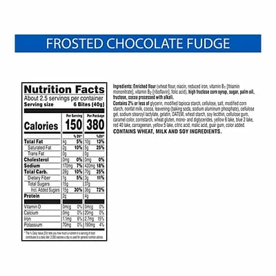 Ingredients: enriched flour (wheat flour, niacin, reduced iron, vitamin B1, vitamin B2, folic acid), corn syrup, sugar, palm oil, fructose, cocoa processed with alkali, glycerin, modified tapioca starch, cellulose, salt, modified cornstarch, nonfat milk, cocoa, leavening, cellulose gel, sodium stearoyl lactylate, gelatin, DATEM, wheat starch, soy lecithin, cellulose gum, caramel color, cornstarch, gluten, mono- and diglycerides, carrageenan, citric acid, malic acid, guar gum