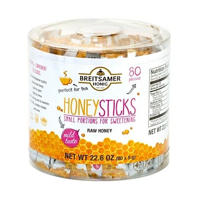 An 80 count tub of Breitsamer Honig Honey Sticks made from natural raw honey