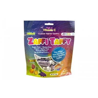 Zaffi Taffy is the delicious, natural way to clean teeth and a healthy smile. Supercharged with Xylitol and Erythritol, this sugar-free taffy candy is a good-for-you treat that helps keep your teeth fresh and healthy. Assorted fruit flavored taffy comes individually wrapped in each 3-Ounce pouch in this 4-Pack. ย Enjoy flavors like Strawberry, Orange, Pineapple, and Grape with these Sugar-Free, Gluten-Free, Vegan, and Dairy-Free Zaffi Taffy pieces!