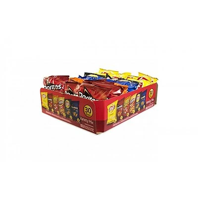 30 Individual Snack Size Bags: Fritos Original Corn Chips, Lay’s Classic Potato Chips, Cheetos Crunchy Cheese Flavored Snacks, 3 Doritos Cool Ranch Chips, 7 Doritos Nacho Cheese Chips, 3 Lay’s Barbecue Potato Chips