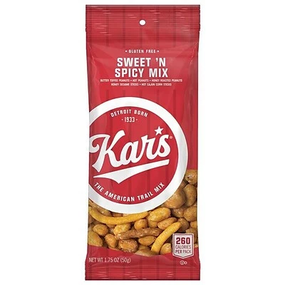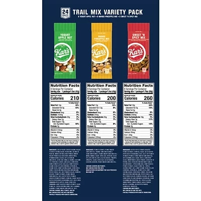 Keep a supply of these tasty nut mixes on hand for the nutritious boost you need to get through the day. This box contains eight bags of Mango Pineapple trail mix, eight bags of Sweet ‘n Spicy mix and eight bags of Yogurt Apple nut mix. The convenient 1.5-ounce and 1.75-ounce bags of Kar’s variety pack make them easy to portion out.