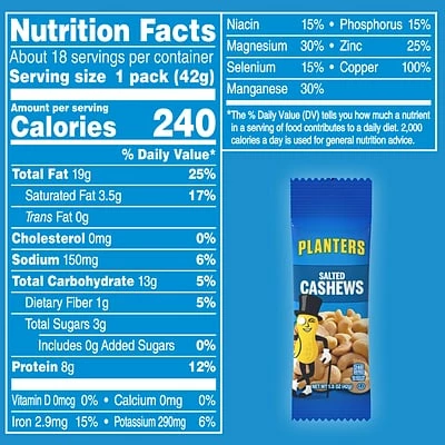 These pouches of cashews are perfect for eating on-the-go, in between meetings, or when you’re lounging around the house! Planters Salted Cashews, 1.75 oz, 18 Count are bursting with deliciously crunchy flavor. Each box contain eighteen 1.75 ounce pouches of Salted Cashews.These Kosher cashews are a great alternative to sugary or unhealthy snacks. Planters Salted Cashews, 1.75 oz, 18 Count is a must have for the office break room, or packed in your lunch each day for a protein-packed cashew snack!