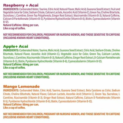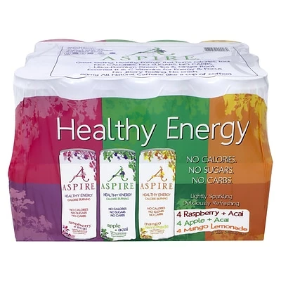 A 12-count pack of Aspire’s 12 oz. energy drinks. This pack comes with four cans each of Raspberry Acai, Mango Lemonade, and Apple Acai flavors. With no calories, sugars, or carbs, and packed with essential B and C vitamins and nutrients, this is an energy drink you can feel good about. The natural ingredients in Aspire can help fuel metabolism, helping you burn more calories without the jittery crash of traditional energy drinks. Substitute your morning coffee, afternoon pick-me-up, or traditional energy drink with Aspire.