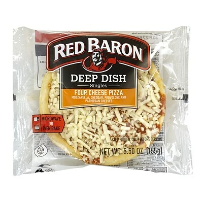 A 12-pack box of Red Baron Deep Dish Pizza Singles in two great flavors