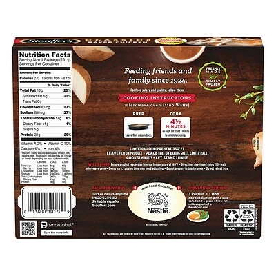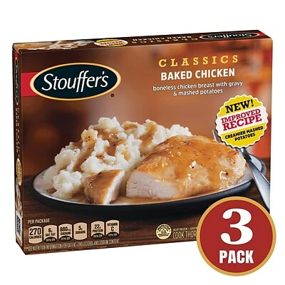 Make your meal tasty and nutritious with Stouffers Classics baked chicken with gravy and mashed potatoes. Cook in both microwave and conventional oven, but do not prepare in a toaster oven. Each portion is one dish with a homelike taste and contains 22 grams of protein.