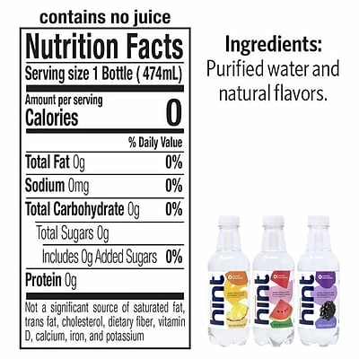 Hint’s unique fruit essences create surprisingly accurate fruit flavors without adding sugar or sweeteners. The result? Delicious Hint Water that tastes like pineapple, watermelon, blackberry, cherry and has zero calories. The Hint Best Sellers Variety 15-Pack includes 5 bottles each of Watermelon, Blackberry, and Pineapple.. Hint is purified, unsweetened, fruit-infused water that has a fresh-picked flavor sure to satisfy your thirst. Hint contains no sugar, no sweeteners, and no calories giving Hint Water a deliciously clean taste that you can feel great about drinking. Most people know that they should be drinking more water and fewer sweetened beverages, but plain water is boring. Hint Water tastes so delicious that it actually helps people drink more water. Staying hydrated can improve your mood, complexion, and muscle and joint health. Hint Water is also vegan, Gluten-Free, nut-free, Non-GMO, and Kosher certified. Hint is the perfect way to hydrate deliciously.
