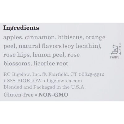 Ingredients: apples, cinnamon, hibiscus, orange peel, natural flavors (soy lecithin), rose hips, lemon peel, rose blossoms, licorice root