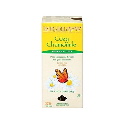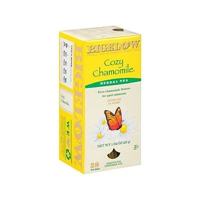 Bigelowยฎ Cozy Chamomile tea is the perfect cup for relaxing before sleepytime or after a stressful day at work. Its floral notes & sweet flavor will soothe your taste buds & relax your body. Individual fresh pack. A relaxing herb tea so delicate and soothing. No caffeine. All natural. Individual fresh-pack locks in flavor. For three generations the Bigelow family has specialized in creating a variety of deliciously different teas and herb teas. Our individually overwrapped tea bags ensure that the last cup of tea you have from this box is just as delicious as the first. Each tea bag is individually sealed in a foil packet. Blended and packaged in the U.S.A.