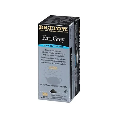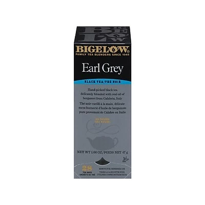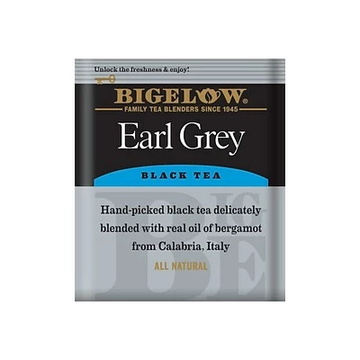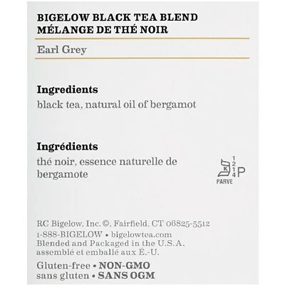 Bigelowยฎ Earl Grey Tea brings you the classic full-bodied flavor of black tea with the fruity notes of bergamot oil for a refined nuanced flavor that is ideal for your morning cuppa. Perfect enjoyed hot or iced. Individual fresh pack. Tea perfectly flavored with natural bergamot. Take your favorite tea wherever you go! Bigelow’s individual flavor-protecting envelopes ensure great taste and freshness. Indulge in the soothing ritual of tea. Sipped throughout the day tea quenches soothes satisfies… and delivers healthful antioxidants. From the wonderful aroma that fills the air the moment it starts steeping you’ll know that Bigelow tea is like no other. To create our distinctive Earl Grey we blend tender hand-picked tea leaves with natural bergamot then individually wrap our tea bags in flavor-protecting pouches to seal in its goodness. Remember adding a cup of Bigelow tea throughout your busy day can contribute to your overall well being. So sit back relax and make tea time your time to refresh mind body and spirit! Blended and packaged in the USA.