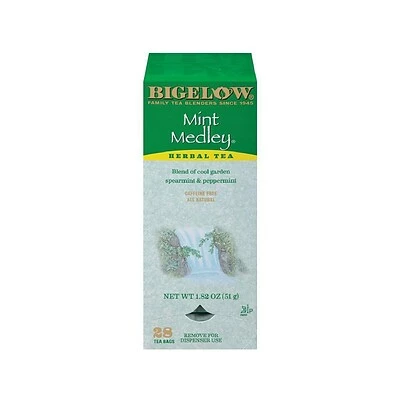 Keep a box of Bigelow Mint Medley herbal tea in the break room for a refreshing taste of peppermint and spearmint. Each box of Bigelow Mint Medley herbal tea contains 28 individually wrapped tea bags to serve everybody in the office.