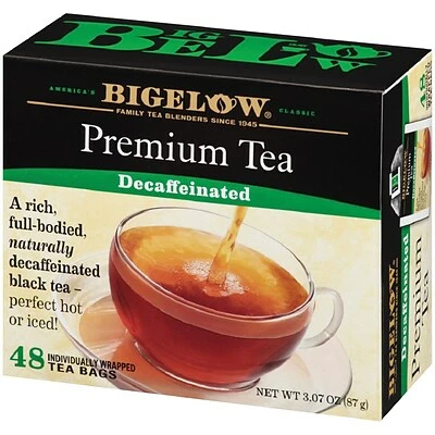 Bigelow Premium 48 Count Decaf Black Tea rich and robust decaffeinated black tea as the English like it. Individual fresh pack. Take your favorite tea wherever you go! Bigelow’s individual flavor-protecting envelopes ensure great taste and freshness. Indulge in the soothing ritual of tea. Sipped throughout the day tea quenches soothes satisfies and delivers healthful antioxidants. From the wonderful aroma that fills the air the moment it starts steeping you’ll know that Bigelow tea is like no other.