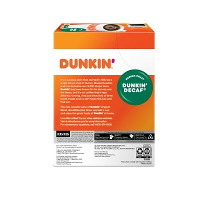 Keep a supply of these decaf pods on hand to enjoy a delicious cup of coffee anytime. Each one works seamlessly with compatible Keurig machines for a rapid cup of joe when needed. These Keurig K-Cup Dunkin’ Decaf pods deliver the famous flavor of donut shop coffee without the caffeine to avoid the buzz. The great tasting flavors and roasts from Dunkin’® are now available in convenient Keurig® K-Cup® pods. The same delicious coffee served in Dunkin’® restaurants is now available for your office with the same consistent taste and recipe used for over 60 years.