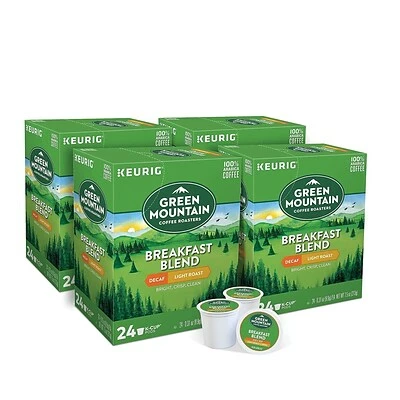Enjoy silky-smooth texture from these decaf coffee pods. The nutty and sweet flavors blend together to provide a high-quality experience, and the pod design makes it simple to brew individual cups. These Keurig K-Cup Green Mountain Coffee Breakfast Blend coffee pods are decaffeinated, letting you experience all the taste without the buzz and jitters.