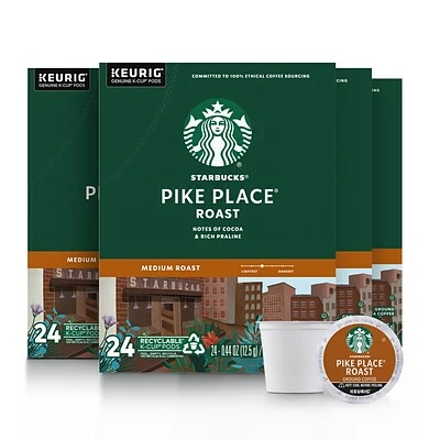 Make mornings more enjoyable with these Starbucks Pike Place Roast coffee pods. The medium roast offers tasting notes of chocolate & toasted nut, while the caffeine delivers a boost of energy to make the morning easier to get through. These Keurig K-Cup Starbucks Pike Place Roast coffee pods come with 96 in a pack, making them a great choice for busy offices or waiting rooms.