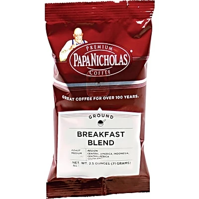 Papa Nicholas® Ground Coffee is filled in 2.5 oz packet and is regular caffeinated to prevent health risk. Medium roast Coffee in breakfast blend flavor delivers high-quality smooth, rich taste and brews 10- 12 cups, sold as 18 packets per case.