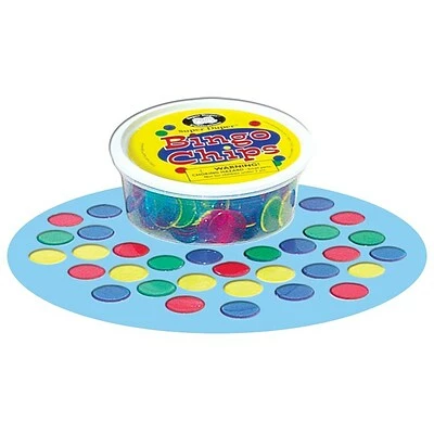 Super Duper® Extra tub contains bingo chips in bright assorted colors that measure 3/4″ in diameter.